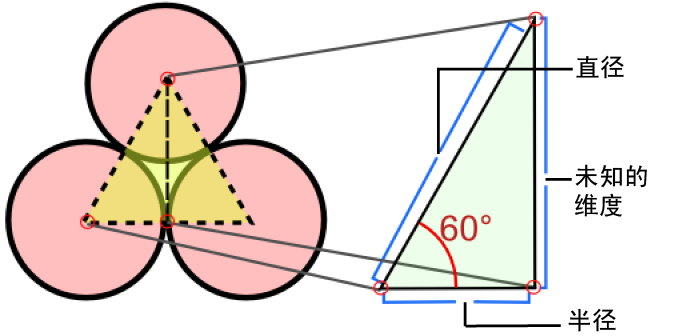 正弦是通过将角对面的边除以斜边所得到的比率。因为桶的中心点沿等边三角形的点分布,该三角形的所有角度都等于 60°。如果将 60° 的正弦乘以三角形的其中一条边的长度,结果就是三角形的高。