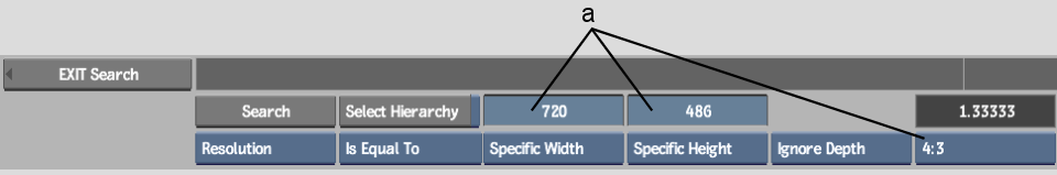 The search tool can be useful, for example, when you need to identify clips of a certain resolution in an archive containing clips of multiple resolutions. You can do this by selecting the corresponding criterion (Resolution) and setting the required arguments in the related fields (Specific Width, Specific High, and Aspect Ratio) as shown in the following illustration.