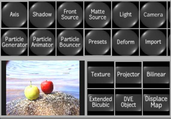 The node bin contains all of the objects that you can add to your scene. The node bin also contains an image node that displays a proxy of the currently selected media. Click and drag within the node bin rows to scroll through all available nodes.