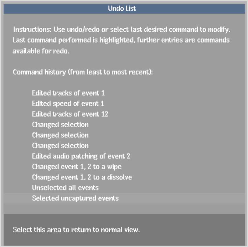Use the Undo List to view all modifications (up to the number of undo levels specified in the Preferences menu)that you made in the current session and undo a single or series of commands.