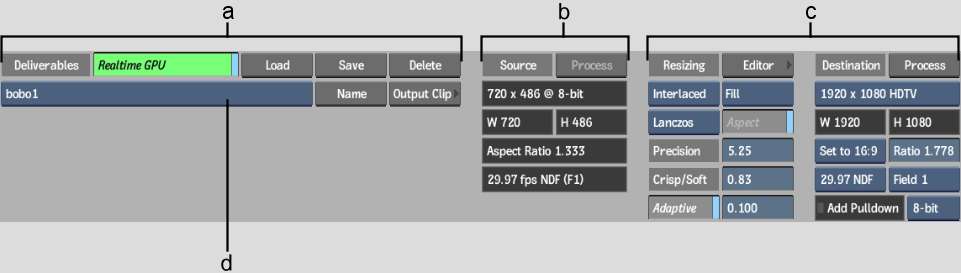 (a) Deliverable controls (b) Source clip information (c) Resize and frame rate controls (d) Deliverable box