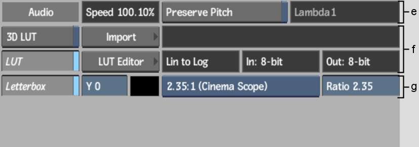 (e) Audio controls (f) LUT controls (g) Letterbox controls