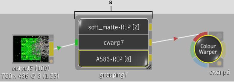A group node is a selection of nodes and clips that are collapsed into one node icon. Each node icon displays the group’s contents, inputs, and outputs. You can create groups for different branches of your process tree and work on each separately. Groups are useful for simplifying cluttered schematics. See Grouping Nodes.