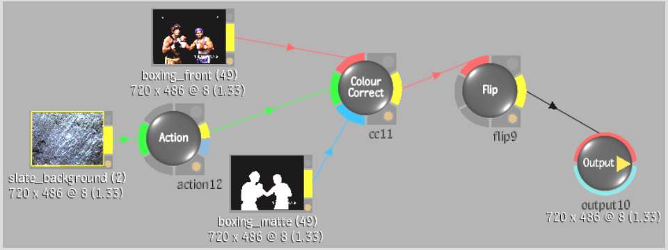 A node is a graphical representation of a function or module that affects a clip or another node in the process tree. Nodes have one or more input points (also called tabs) used for connecting to clips. For example, a Colour Correct node accepts a Front, Matte and Back connection. An Output node accepts a video and an audio input.