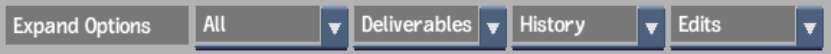 You can expand or collapse selected clips with real-time settings, history, or soft edits from a clip libary. You can also display or hide selected clips. Select options from the Expand Options group of dropdown lists or click a clip indicator to toggle the display of the associated deliverable, history, or source clip display for the clip.