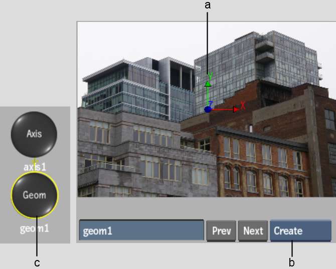 (a) Axis in scene corresponds to Axis node in schematic (b) Create mode for drawing mask (c) Geometry node is automatically linked to Axis node