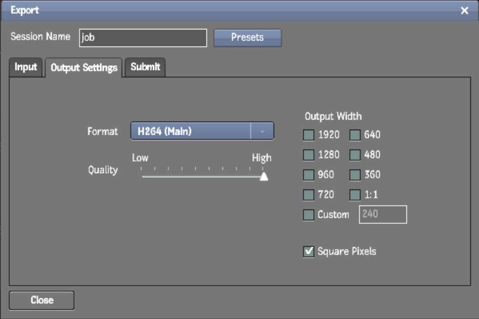 This name is used to create a subdirectory on the server to hold the encoded clips. If no Session name is entered, the name of the first clip selected, when entering the export panel, is used.