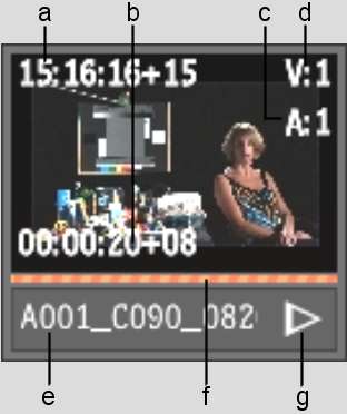 (a) Current timecode (b) Duration (c) Audio track indicator (d)Video track indicator (e) Clip name (f) Scrubbable progress bar icon (g) Play/Pause icon