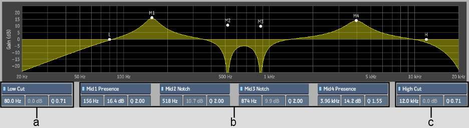 You can use any of six available filter or nodes: one Low node, four Mid nodes, and one High node. The Low node can be set to use either a Low Shelf filter or a Low Cut filter. The four Mid nodes can each be set to either a Mid Notch filter or a Mid Presence filter. The High node can use a High Shelf filter or a High Cut Filter.