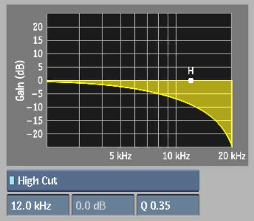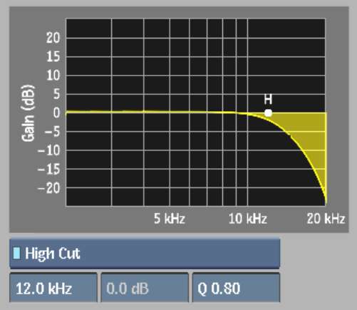 The High Cut filter (commonly known as a low-pass filter) works on the high frequencies of the audio signal (1 to 20 kHz). The High Cut filter is most commonly used to reduce noise and hiss, and to eliminate pops. By specifying a frequency for the high EQ, you set the cutoff frequency. Frequencies below the cutoff frequency pass through unaffected. Frequencies above the cutoff frequency are attenuated at a constant rate, depending on the Ratio setting. Adjust the Q curve to determine the range of frequencies affected. The default cutoff frequency setting is 12 kHz with a Q value of 0.71.