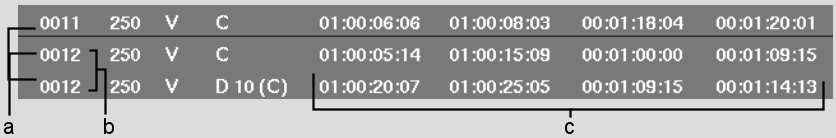 An EDL contains events, edits, and entries. An event is a complete element in the EDL such as a shot, dissolve, or wipe. An edit is an individual component that makes up an event, such as an outgoing shot or an incoming shot. An entry is an individual value for any variable in the edit, such as dissolve length, Source In, or Speed.