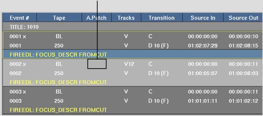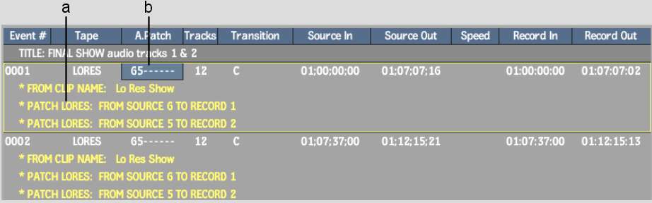 The source tracks that have been patched to different audio tracks than the defaults are indicated in the affected event's Audio Patch Field. Dashes in the Audio Patch Field indicate the track is patched to its default. Comments are also added which indicate the name of audio tracks and their patching information.