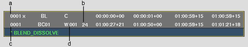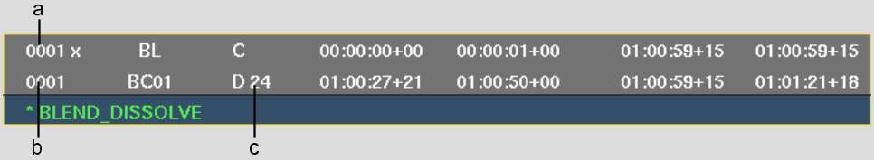 Dissolves are represented in the EDL by two consecutive edits with the same event number. The first edit represents the outgoing shot of the dissolve and the second edit represents the incoming shot of the dissolve. The dissolve is listed in the Transition column of the second edit as D n (where n is the transition duration).