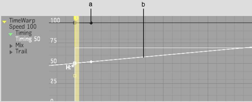 In the Channel Editor, you can see that the speed curve and timing curve are, by definition, dependent on each other. You cannot change the speed without affecting the timing. Any action performed on one curve results in a corresponding action on the other. If you add a keyframe to the speed curve, then a keyframe is automatically added to the timing curve at the same frame.