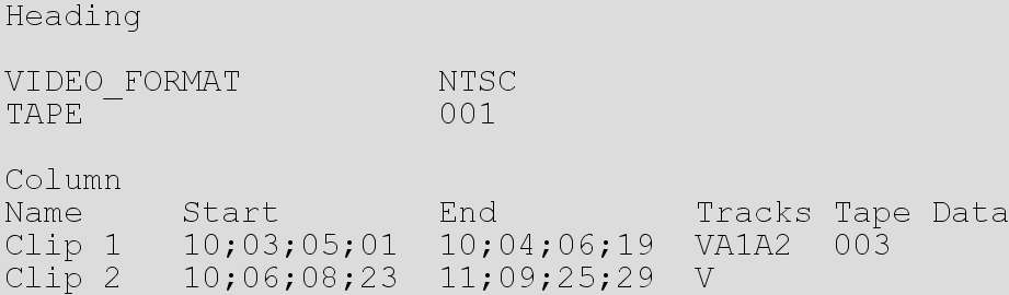 The Heading section contains information such as the video format and tape name. The Column section contains the heading names for the data, such as start timecode, end timecode, start and end keycode, and track information. The Data section contains the data for the file, such as timecode, name, and track information.