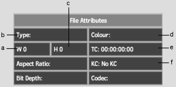 The File Attributes group displays the attributes that are available for a file, when its filename is selected in the file browser. These attributes may include any of the following: file type, pixel width, pixel height, colour model, timecode, keycode, aspect ratio, bit depth, and codec.