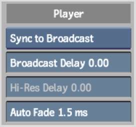 Monitor Sync boxIndicates which monitor will have audio sync when you play back a clip—the broadcast monitor or the high-resolution monitor. Use this box to compensate for audio sync differentials between the two monitors. If necessary, specify the audio delay in the corresponding broadcast or high-resolution monitor.