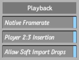 Player 2:3 Insertion buttonEnable to allow viewing 23.97 fps clips at 29.97 fps in the Player and in the broadcast monitor. A virtual (temporary) 2:3 insertion is performed in real time. You can only play back with 2:3 insertion at normal speed. If you speed up or slow down playback, insertion is not applied.