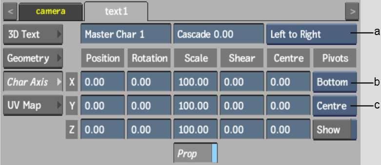 Cascade fieldDisplays the amount of time (expressed in frames) to offset the animation of other characters from the master character. The animation that is offset includes all numeric fields in the Character Axis tab, as well as the Specular, Ambient, Diffuse, Transparency, and Shine fields in the Geometry tab.