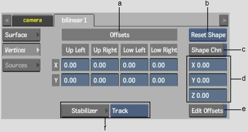 (a) Offsets fields (b) Reset Selection box (c) Shape Channel button (d) Vertex Translation fields (e) Edit Offsets button (f) Stabilizer controls
