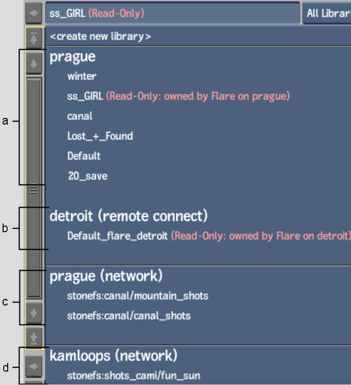 (a) Current project libraries owned by Smoke (b) Current project libraries not owned by Smoke (c) Network library of another project on the system to which Smoke is connected (d) Network library of another project on another system
