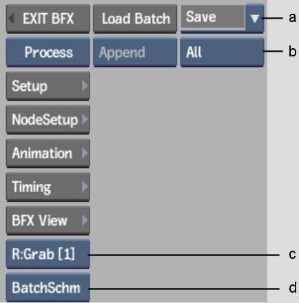 | <node name>Schm (Esc)(~) | The schematic for the selected node. (This option appears when an Action or a GMask node is selected. Some of these nodes have other options that also appear.) |