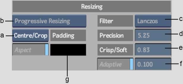 (a) Fit Method box (b) Resize Field Format box (c) Filter box (d) Precision field (e) Crisp/Soft field (f) Padding colour pot (g) Adaptive field