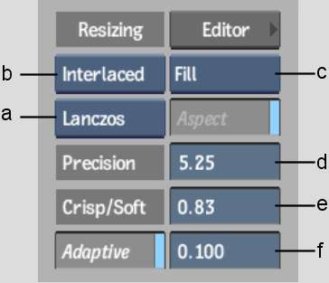 (a) Filter box (b) Resize Field Format box (c) Fit Method box (d) Precision field (e) Crisp/Soft field (f) Adaptive field