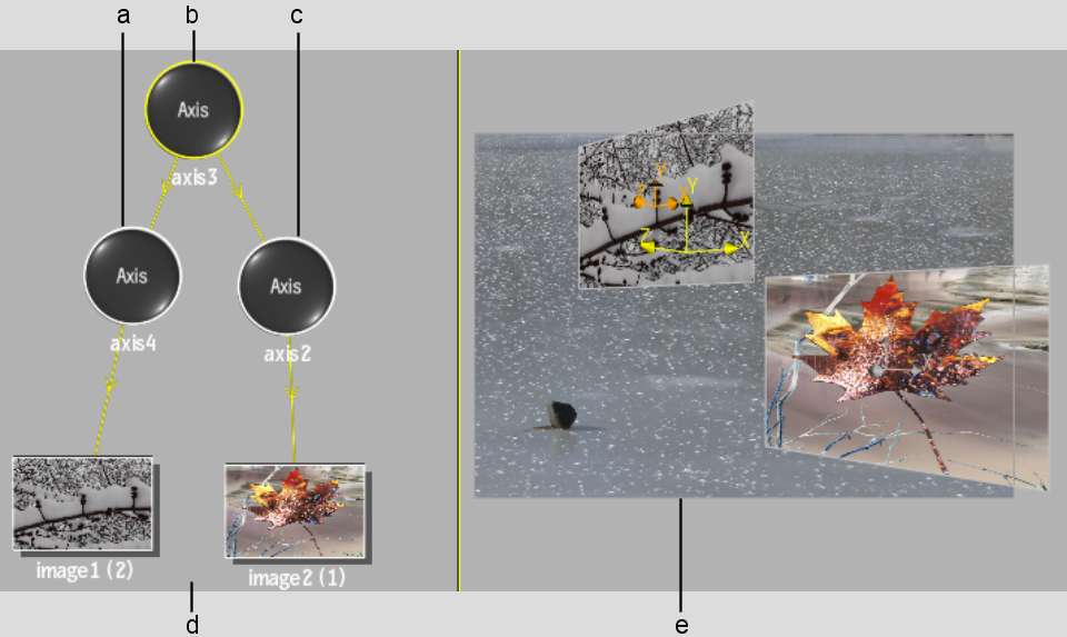 (a) Axis4 node is child of axis3 and parent of image1 (b) Axis3 node is parent of axis4 and axis2 (c) Axis2 node is child of axis3 and parent of image2 (d) Schematic view (e) Result view of scene