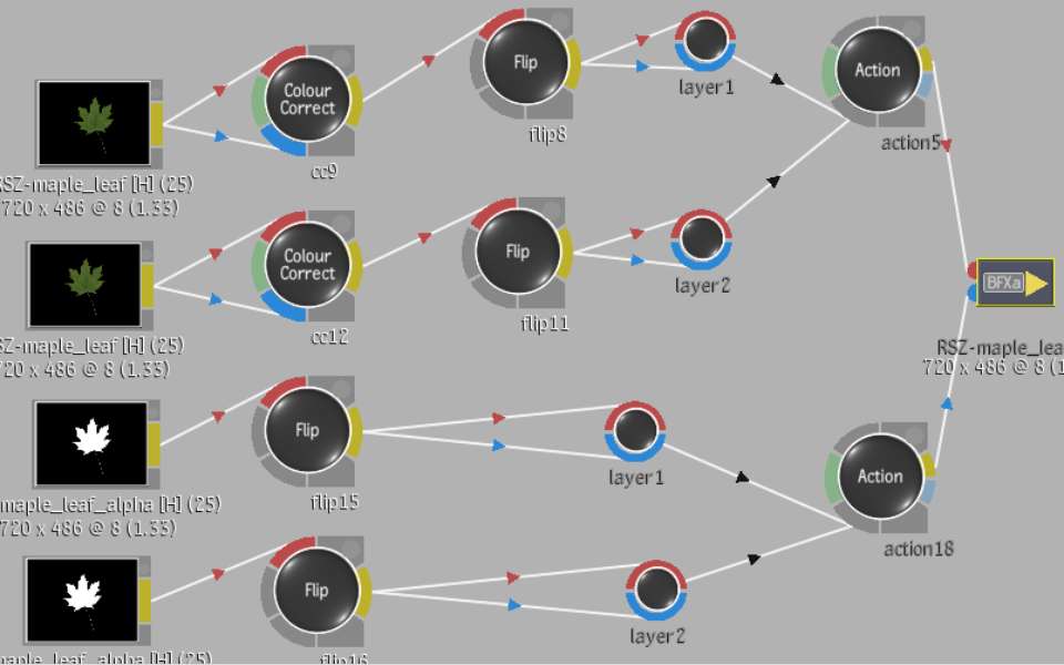 When you are finished the front clip, copy the applicable nodes and attach them to the matte clip. There is no need to recreate the setups for the matte. Add nodes to the matte for the required effect. Attach the process tree for the alpha clip to the matte input tab of the BFX output node. See the following illustration.