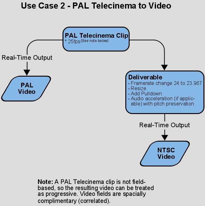 In this example, NTSC and PAL video are output, but the source material is a PAL Telecinema clip. Because a PAL Telecinema clip is not field-based, the resulting video can be treated as progressive. Its video fields are spatially complementary.