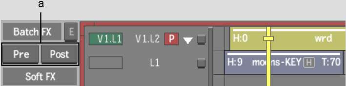 You access Batch from the EditDesk record timeline. You can bring a source into a BFX level, leaving its soft effects on the EditDesk record timeline, by clicking Pre. Or, you can bring in sources after they were modified with soft effects by clicking Post. See Creating Batch FX.