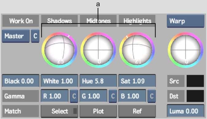 Shadows trackballModifies the chroma in the low luminance area without affecting the luma.