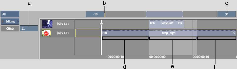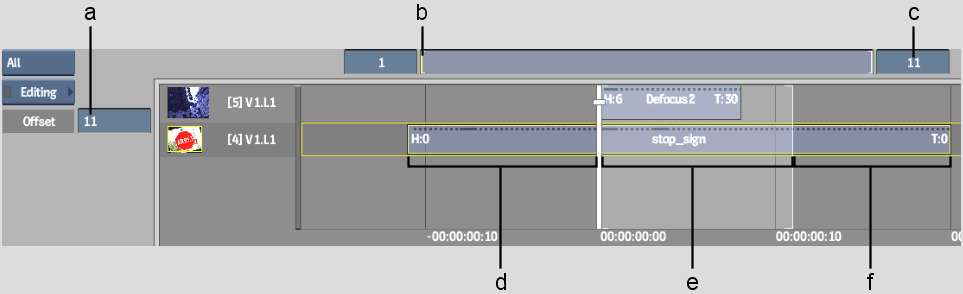 (a) Head frame number (b) BFX timebar positioner (c) Clip length including head and tail frames (d) Head frames (e) Frames between in and out points (f) Tail frames