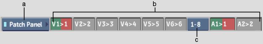 Use the patch panel to “lock” video and audio signals between the Source Area and the Record Area. Normally, when a source clip is used in an editing operation, the Primary video track in the source clip is applied to the Primary video track in the record clip; the first audio track in the source clip is applied to the first audio track in the record clip, and so on. You can change this default mapping in the patch panel.