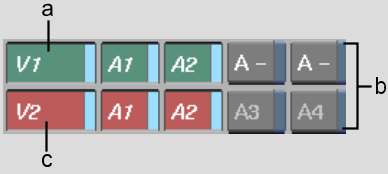 The top row of patch boxes corresponds to the video and four or eight audio tracks of the source clip. Source tracks are green. The bottom row corresponds to the record tracks and is red. Grey fields represent deactivated channels. In the Player, the source Primary video track is mapped to the Primary video track on the timeline. The Primary source and video tracks can be any existing video track.