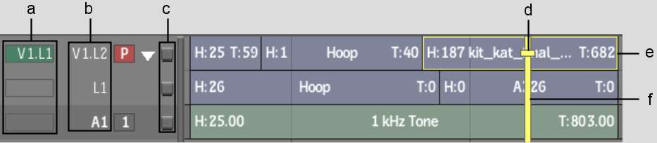 Patch and track identifiersIndicate patching for video and audio tracks. See Patching Video and Audio Channels.