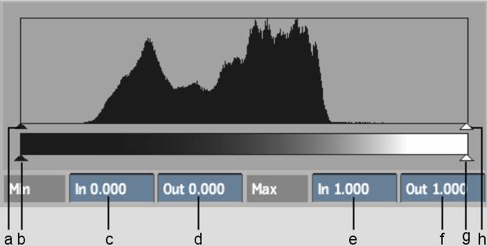 (a) Minimum Input slider (b) Minimum Output slider (c) Minimum Input field box (d) Minimum Output field (e) Maximum Input field (f) Maximum Output field (g) Maximum Output slider (h) Maximum Input slider