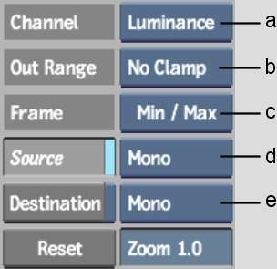 Destination buttonEnable to show a histogram of the colour values in the result, or destination clip. The destination colour values are obtained from the current frame. If you input both front and matte clips, the colour values in the front clip that are defined by the white part of the matte are displayed.