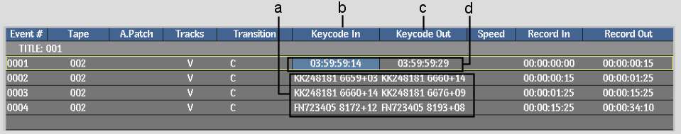 (a) Keycode for events  (b) Keycode In column  (c) Keycode Out column  (d) Timecode for event with missing keycode