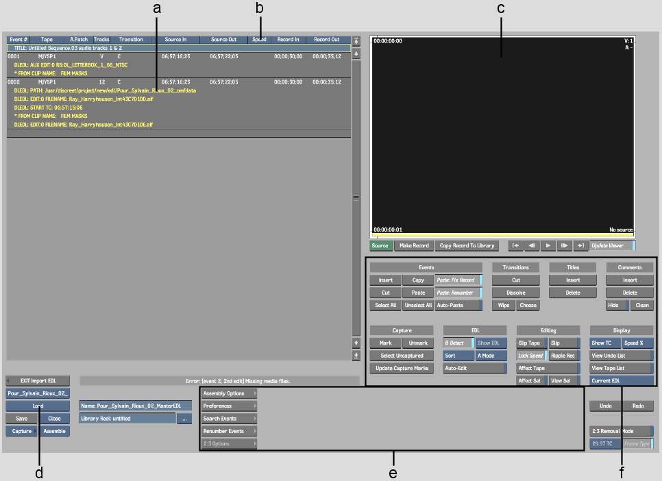 (a) EDL work area  (b) Work area column headers  (c) EDL Player  (d) Load button  (e) Import EDL menus  (f) EDL editing tools