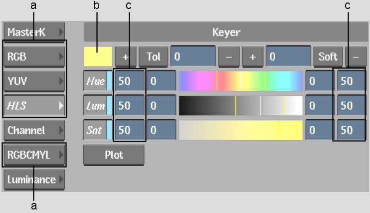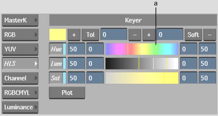 To determine which colour model will give you the best key, try creating a sample matte for each model. Each model operates independently. When you switch from one model to another, the values you set are retained, so you can easily compare the results.