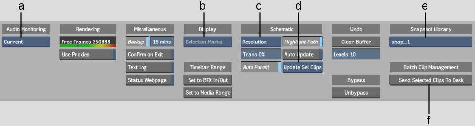 (a) Batch Audio Source box (b) Selection Marks box (c) Clip Info box (d) Update Clip box (e) Snapshot Library box (f) Send Selected Clips to Desk button