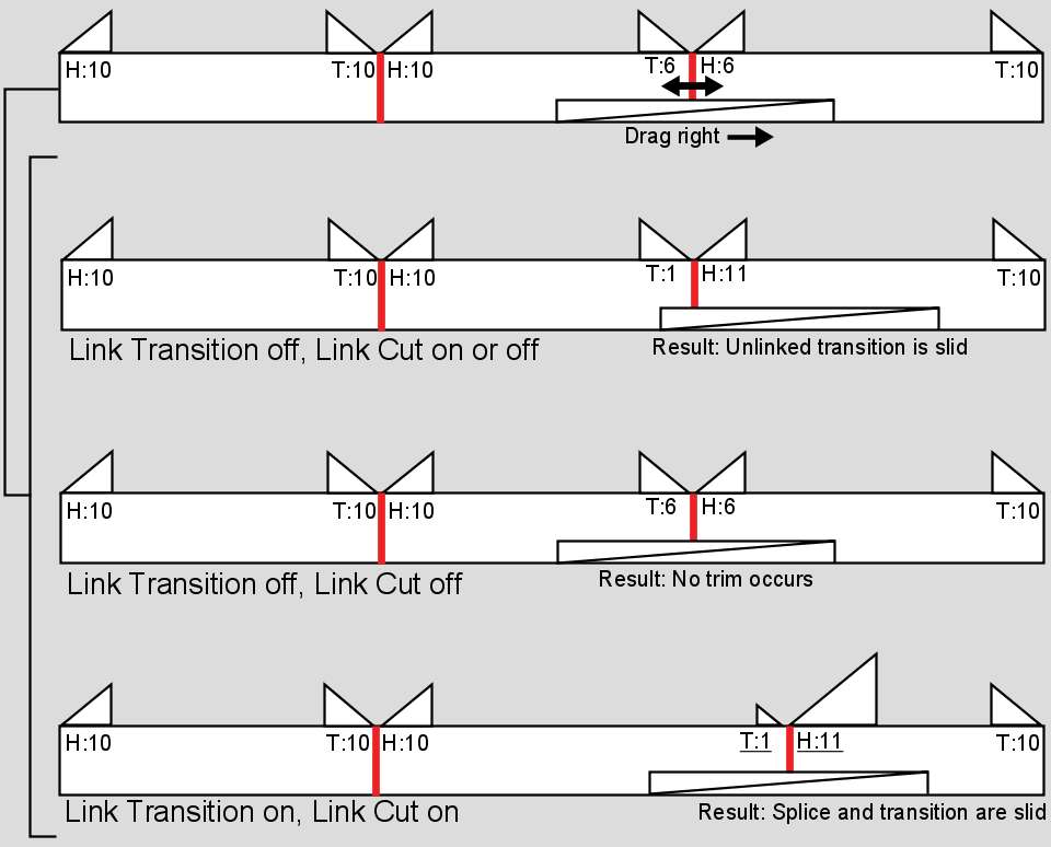 NoteIf you slide a dissolve or wipe with Ripple, Link Transition, and Link Cut all on, this combination of variables causes the same effect as a standard trim on the linked elements. The edit sequence ripples, as this is not a true dissolve or wipe slide.