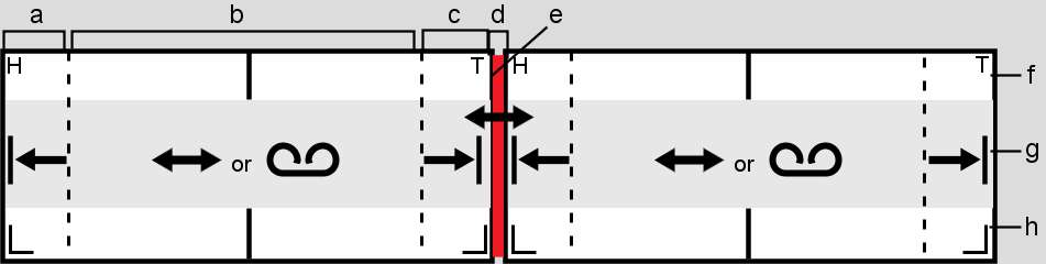 (a) Trim Head cursor (b) Slide or Slip cursor (c) Trim Tail cursor (d) Slide cursor (e) Transition (f) Clip Selection area (for moving the clip in the Record Area) (g) Trim Cursor area (h) Clip Shuttle area