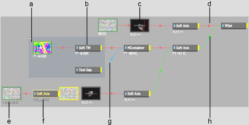 (a) Container (Collapsible)  (b) Soft Effect element  (c) Module element  (d) Front  (e) Source clip (outlined in green)  (f) Greyed out text of non-editable element  (g) Matte  (h) Back