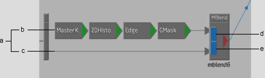 The Front and Matte pipes of the MBlend node are both designed to result in a matte. This is represented visually by a blue box at the right of the Front and Matte pipes. You can place any node on the Front and Matte pipes that results in a matte, including the MasterK, 2D Histogram, GMask, Edge and Degrain nodes.