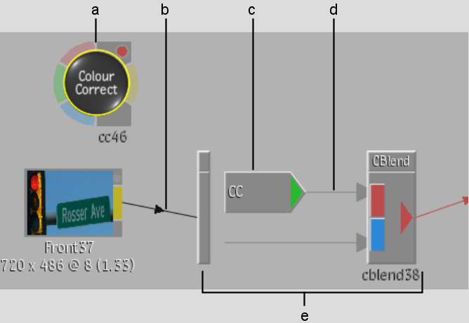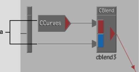 Use the nodes on the CBlend pipes to apply colour corrections and other processes to clips. Use the nodes on the MBlend pipes to create a matte for the composite. See Using Blend Nodes.