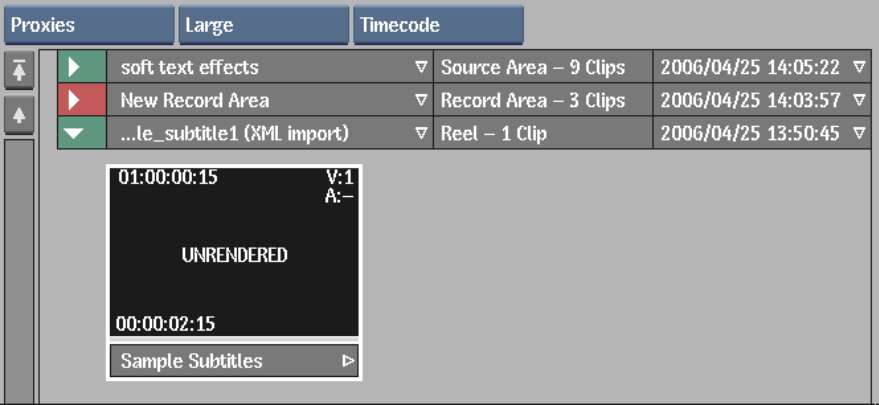 A new reel appears with an unrendered clip containing the Subtitle XML file. The reel's name is the same as the Subtitle XML filename. The clip's name is retrieved from the name element in the XML code. See Basic Elements.