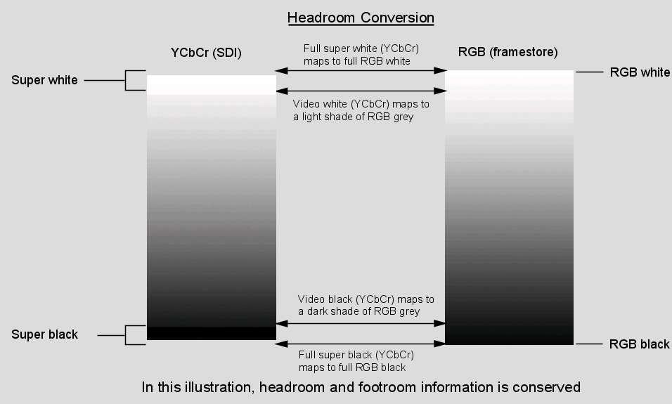 Using the YCbCr<->RGB with headroom colour space option during input on Smoke systems, it is possible to capture these super black and super white values. In this case, video black YCbCr (64,512,512) maps to RGB (64,64,64) in 10 bits, and video white YCbCr (940,512,512) maps to RGB (940,940,940). YCbCr Luma values between 4 and 64 and between 940 and 1019 are converted to RGB on capture. While this gives you the advantage of being able to capture super black and super white values, it also means that video black will not map to full black in RGB, and video white will not map to full white in RGB. The following image illustrates this:
